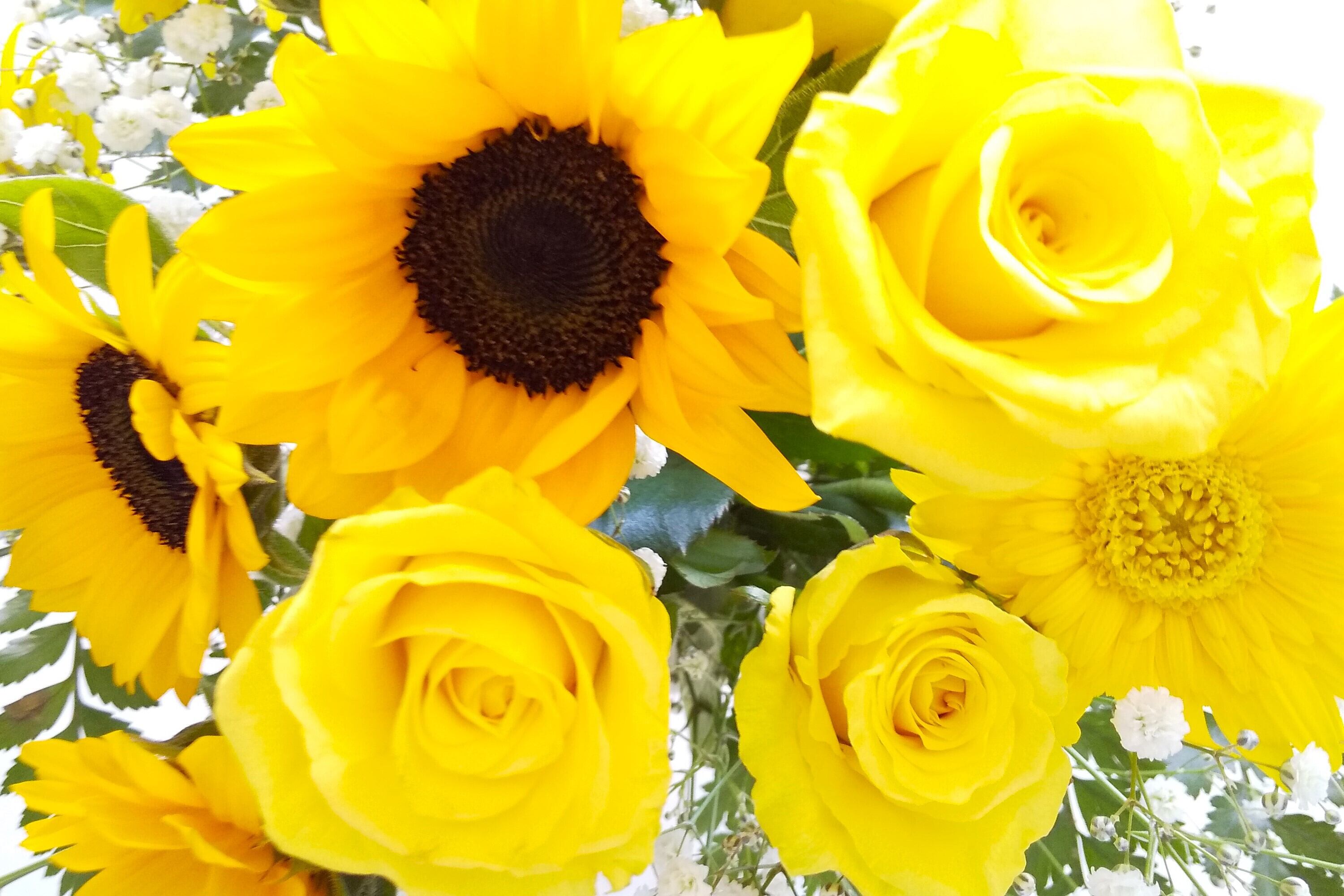 ・使用したお花&ストーン・・・バラ・ガーベラ・ひまわり・カスミソウ+イエローベリル